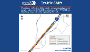 Cambio de tráfico en la I-4 en dirección este a la altura de World Drive