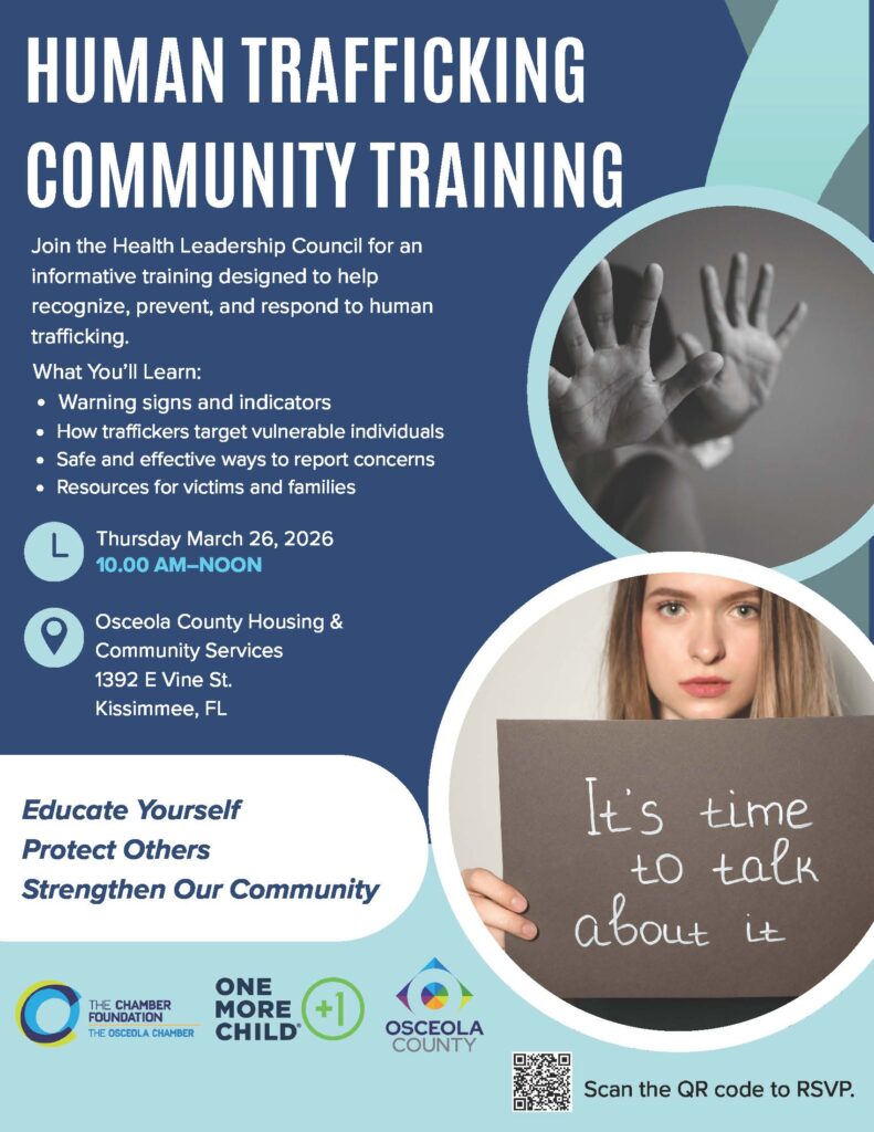 Osceola County, FL – Human trafficking remains a critical problem in our community, with Florida currently ranking third in the United States for reported cases. As part of Osceola County’s ongoing commitment to education and community safety, a training session for partners and community members will be offered for the first time.